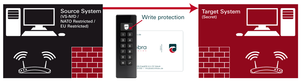 The features of the Kobra VS storage devices (Kobra Stick VS and Kobra Drive VS) offer extensive possibilities for the secure storage, archiving and transmission of sensitive, personal and confidential information up to classification level EU RESTRICTED, NATO RESTRICTED and German VS-NfD.