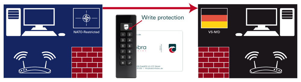 The features of the Kobra VS storage devices (Kobra Stick VS and Kobra Drive VS) offer extensive possibilities for the secure storage, archiving and transmission of sensitive, personal and confidential information up to classification level EU RESTRICTED, NATO RESTRICTED and German VS-NfD.